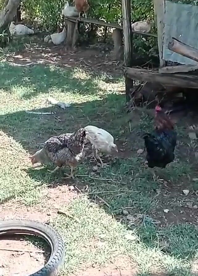 group of chickens in a grassy, semi-rural yard. There's a black rooster with a red comb standing near two smaller chickens, one white and one mottled gray and black, foraging on the ground. In the background, other chickens are perched on wooden planks or resting in the shade of a tree. A rickety, partially-built structure with wooden supports and a metal sheet is to the right of the frame. A tire sits in the bottom left corner. The sun is shining.