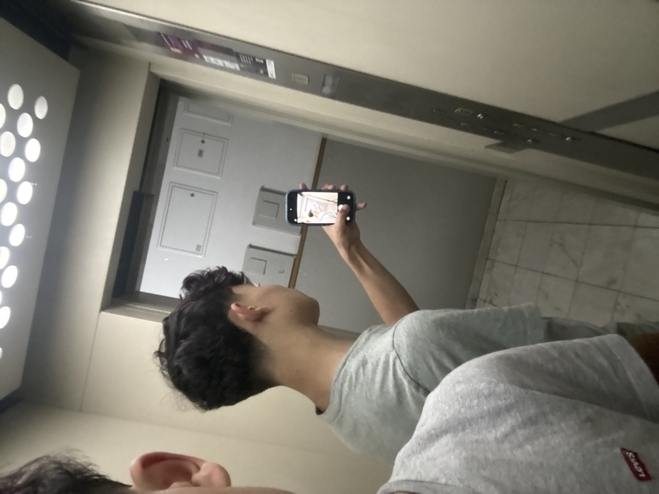 The image depicts the interior of an elevator located in Quarteira, Portugal. Two individuals are present. One person, with short, dark, curly hair and a faded haircut, is seen from the back and left profile, wearing a light grey t-shirt. This individual holds a light blue smartphone in their extended right hand, angled to capture their reflection in the elevator's interior, indicative of taking a mirror selfie. The smartphone's screen displays a partial image, likely of a person. A second individual is partially visible in the immediate foreground on the left, showing the back of their head and a shoulder, wearing a light grey t-shirt with a red "Levi's" logo patch on the left chest area. The elevator's interior features light-colored walls, a ceiling with multiple circular recessed lights, and a floor tiled with light-colored square tiles. A metallic elevator control panel is visible on the right wall.