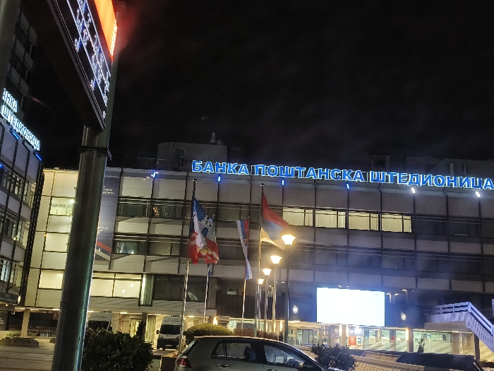 A night scene captures the "Banka Postanska Stedionica" building under a dark sky