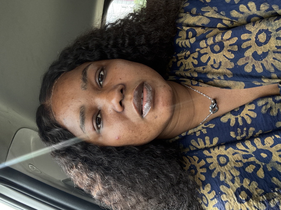 A forensic examination of the image reveals a close-up portrait of a single individual, a female of dark complexion, seated within what appears to be the interior of a vehicle. The scene is located in the city of Ilado, Nigeria. The individual, positioned centrally, possesses dark, wavy, shoulder-length hair, styled with a middle part. A small blemish or pimple is observed on her left cheek. Her lips are slightly parted, exhibiting a light-colored gloss or highlight. She wears a dark blue garment adorned with a repeating pattern of gold-colored, stylized floral or circular motifs. Around her neck, a silver-colored chain necklace is visible, featuring two interlocking heart-shaped pendants, one silver and one dark-colored. Her gaze is directed straight into the camera, maintaining a neutral expression. The immediate environment suggests an indoor setting, specifically a vehicle, indicated by the visible light-colored headliner above the individual's head and the presence of a window frame on the upper left. A streak of light, possibly a reflection, is present in the upper left quadrant of the image. The background outside the vehicle, partially visible through a window on the right, is blurred, showing indistinct shapes consistent with an urban or residential exterior.