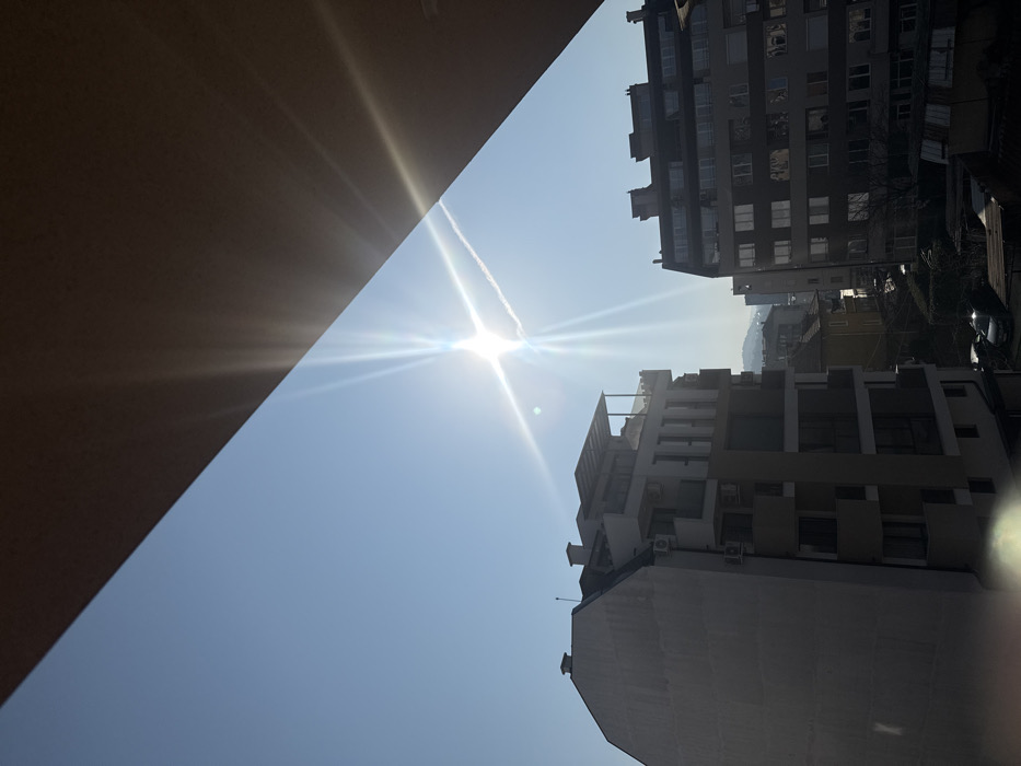 The image displays an urban environment in Blagoevgrad, Bulgaria, captured from an elevated vantage point. The upper right portion of the frame is diagonally obscured by a dark, uniform overhead structure. The sky is clear and light blue, with the sun prominently positioned in the upper center, emitting distinct starburst lens flares. A visible contrail from an aircraft traverses the sky horizontally, intersecting the sun's position. In the left midground stands a multi-story residential building featuring a light-colored facade, multiple balconies with glass railings, and external air conditioning units. Its top level includes a large terrace with a visible canopy. To the right and slightly further back, another multi-story residential building with a darker facade and numerous windows is visible. Interspersed between these main structures and extending into the background are smaller, older buildings with various rooflines, including one with a yellow facade. Distant hills or mountains are discernible on the horizon. The lower sections of the image reveal sparse, mostly bare vegetation and a street with at least one parked vehicle. No individuals or specific actions are depicted within the scene.