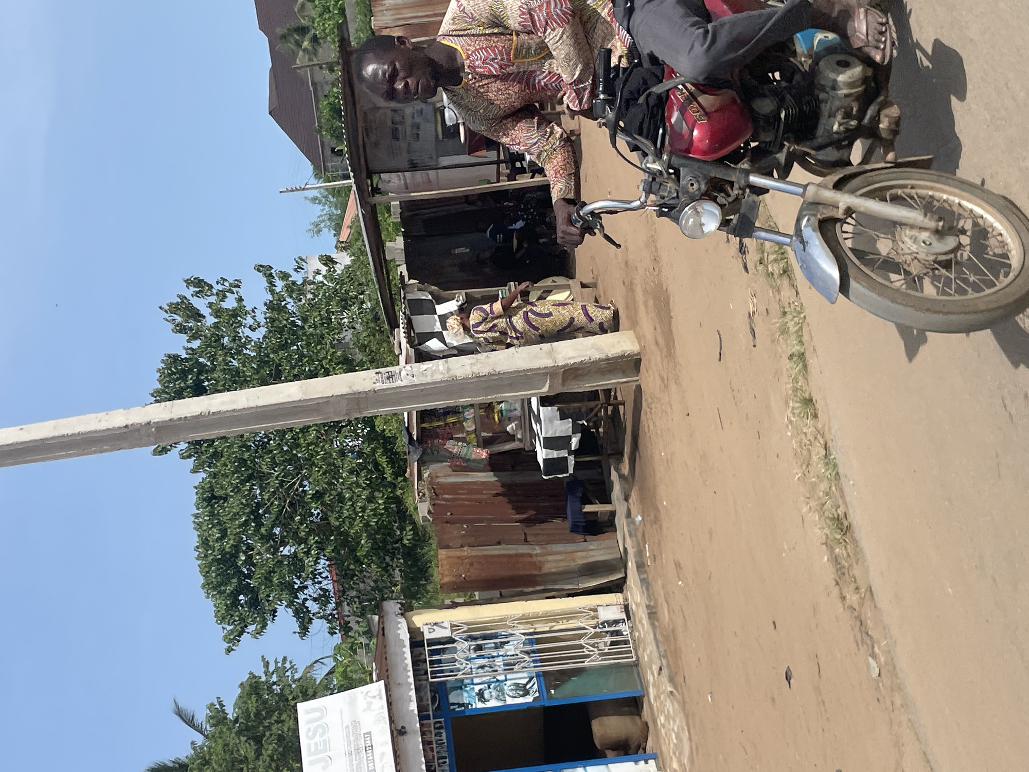 The image depicts a man on a motorcycle on a street in Ikoga, Nigeria