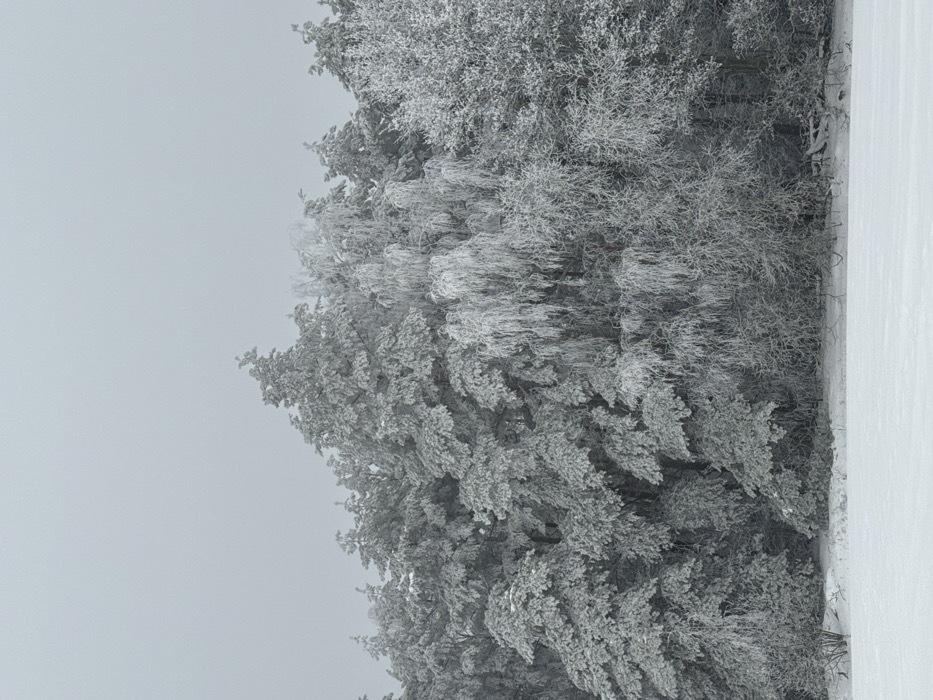 The image displays a winter landscape located in Квасоўскі сельскі Савет, Belarus. An unbroken, light grey, overcast sky occupies the upper portion of the frame. The foreground consists of a flat, undisturbed expanse of white snow. A dense line of trees extends across the midground and background. These trees, primarily a mix of coniferous species and leafless deciduous trees, are uniformly and heavily coated in white snow and hoarfrost. The coating is thick on all visible branches and needles, rendering the forest predominantly white and grey. No individuals, animals, or artificial structures are present. The scene is static, depicting a natural, frozen environment.