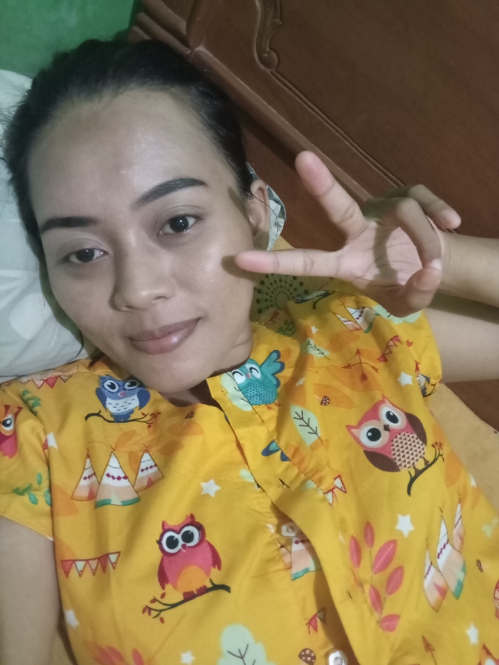An individual is captured in an indoor setting, identified as located in Kecamatan Pati, Indonesia. The subject is an adult female, positioned supine with her head resting on a white pillow, against a background featuring a light green wall section and a brown wooden headboard or bed frame exhibiting carved detailing. She has dark hair, pulled back, and her face shows a slight smile. Her left hand is raised near her face, performing a V-sign gesture with the index and middle fingers extended. She is wearing a short-sleeved, yellow garment patterned with multicolored cartoon owls, teepees, leaves, and stars. The individual's gaze is directed towards the camera.