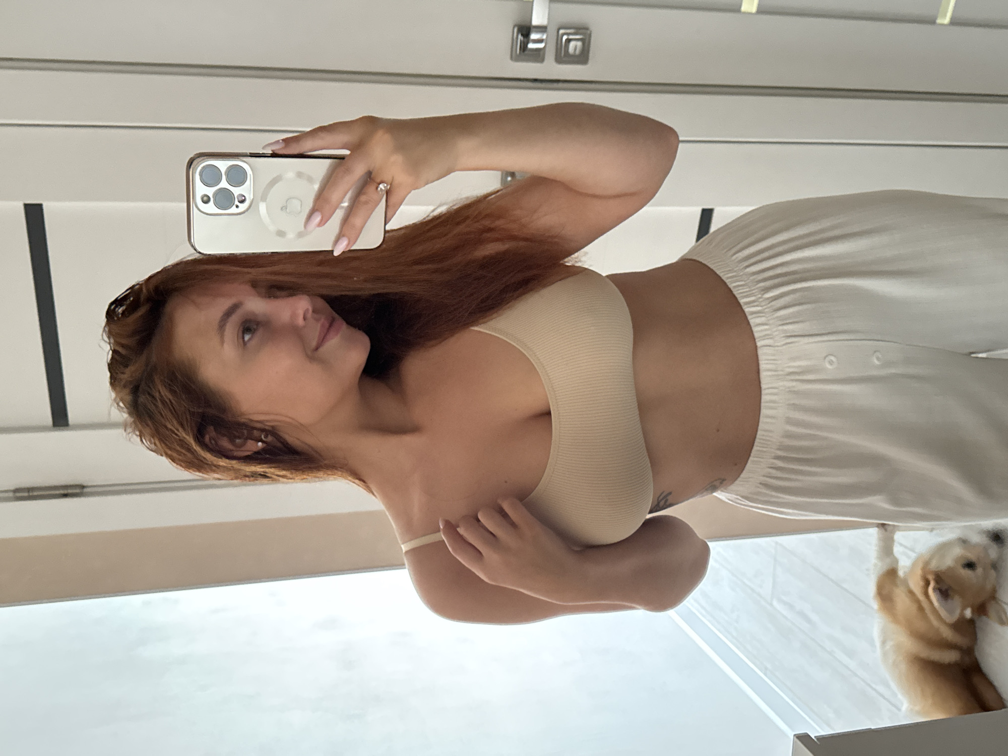 A woman is taking a selfie in what appears to be a bathroom. She is wearing a beige bra top and light-colored pants. She is holding an iPhone in her right hand, with the camera facing her. Her hair is auburn and shoulder-length. The background shows a white door with dark trim and a bathroom fixture. A golden retriever dog is partially visible in the lower right corner. There are no indications that the image was taken in Chaikovsky, Russia.