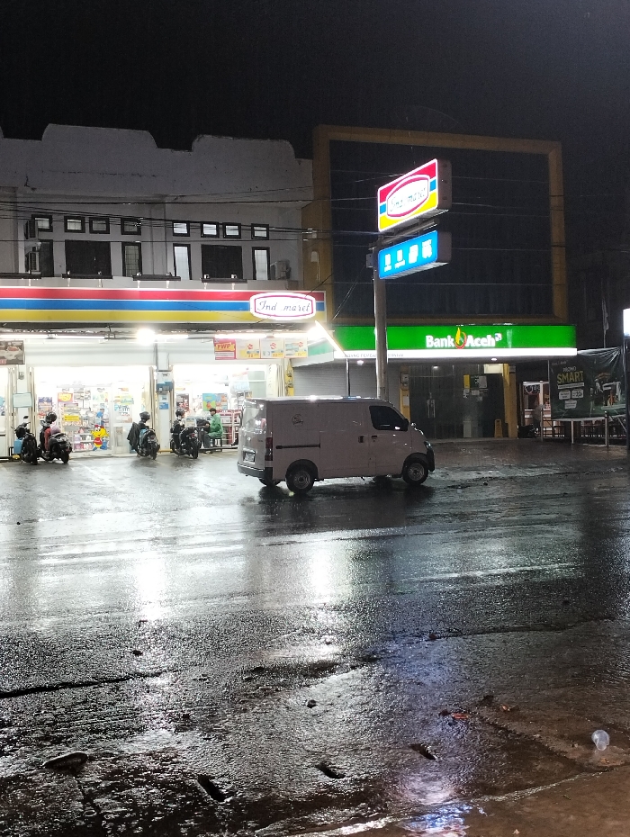 This image captures a nighttime street scene in Jeunieb, Indonesia. The ground is a dark, wet asphalt surface, highly reflective of the artificial light sources, indicating recent rain or standing water. On the left, a two-story building houses an illuminated "Indomaret" convenience store on its ground floor, identified by its distinctive red, blue, and yellow logo and bright interior lighting. The upper floor of this building is white with multiple dark, rectangular windows. Adjacent to Indomaret on the right, a "Bank Aceh" branch is visible, featuring a green facade with white lettering. A tall pole sign stands between Indomaret and Bank Aceh, displaying the "Indomaret" logo at the top and a blue sign with white icons below. Further to the right, a darker building is partially framed by a yellow structure. A light-colored, possibly white or light grey, commercial van is positioned on the wet street in the mid-ground, facing towards the right side of the frame. Several motorcycles are parked or idling near the entrance of the Indomaret store, with at least four discernible. Multiple individuals are present within the illuminated Indomaret entrance area, some appearing to be associated with the motorcycles, others standing. The scene is dominated by artificial lighting from the commercial establishments and signage, which creates strong reflections on the wet road. The sky above is dark. Power lines are visible traversing above the buildings. In the foreground, a white plastic cup and minor debris are discernible on the wet road surface. An advertisement, partially visible on the far right, includes the word "SMART."