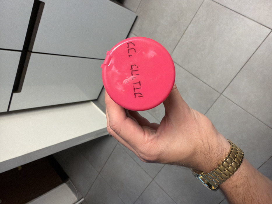 Kadima, Israel. The image depicts a high-angle view of a person's right hand holding a vibrant pink cylindrical container. Black Hebrew text is printed on the container's top, reading 'לכי להובדק' (Lechi Le'Hovdak), which translates to 'Go for inspection' or 'Go to be checked.' A subtle hinge is visible on the container's top surface. The person's left forearm is visible, displaying a gold-colored metal link wristwatch on the wrist. The environment consists of a light gray tiled floor with darker grout lines. In the background to the right, light-colored modern cabinetry with dark horizontal handles is present. To the upper left, a partially open dark brown door reveals a darker interior space.