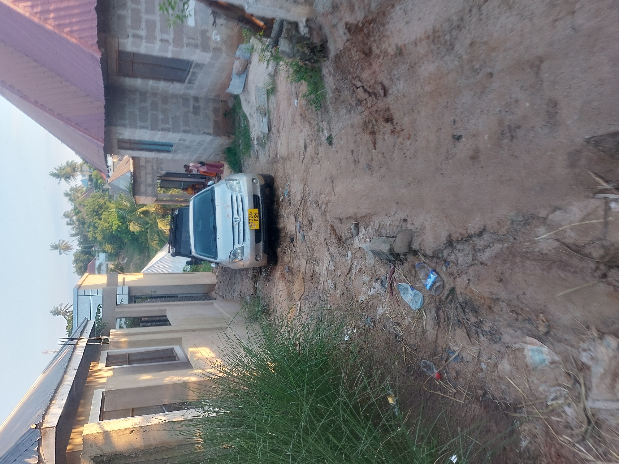The scene depicts a narrow, unpaved road in a residential area. A light-colored minivan with a yellow license plate is parked in the middle of the road. The road surface appears uneven and eroded. To the left and right are buildings, one appearing to be under construction. Vegetation, including tall grass, is visible. Debris such as plastic bottles litters the ground near the vehicle. In the background, two women are seen standing near the building behind the minivan. Based on the visual elements, the location is residential and appears to be an informal neighborhood of Dar es-Salaam, Tanzania.