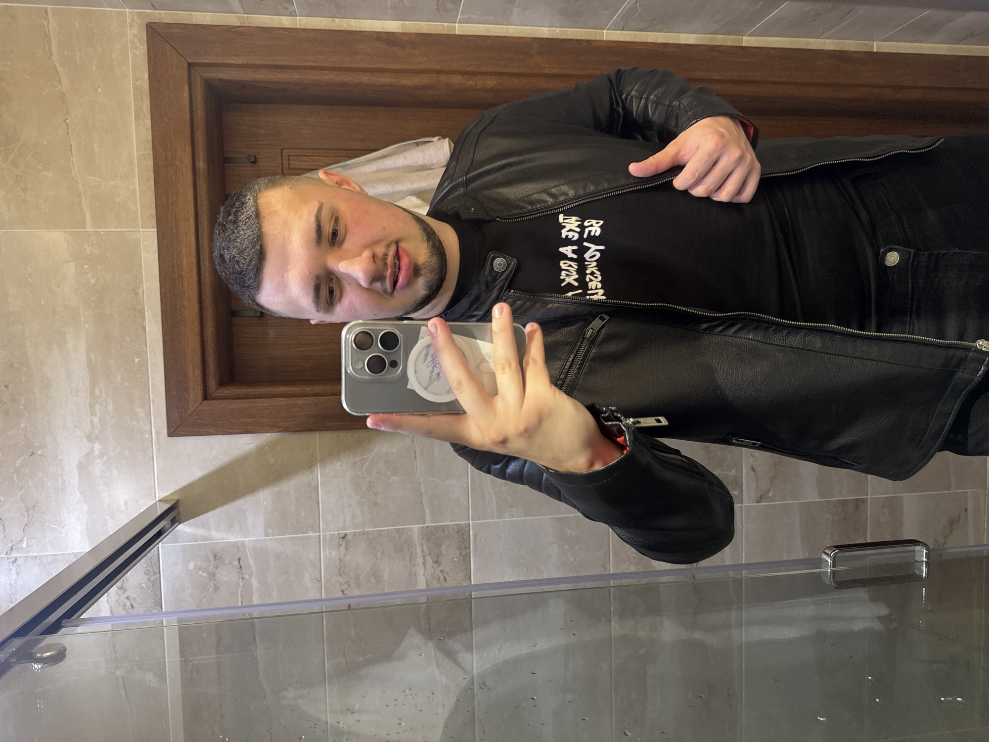 A man is taking a selfie in a bathroom. He is wearing a black t-shirt with white writing on it, a black leather jacket, and black pants. He is holding a phone in his left hand. The background includes a brown door, beige tiled walls, and a glass shower door. It is not possible to determine if the location is in the city of Sofia, Bulgaria, from the image alone.