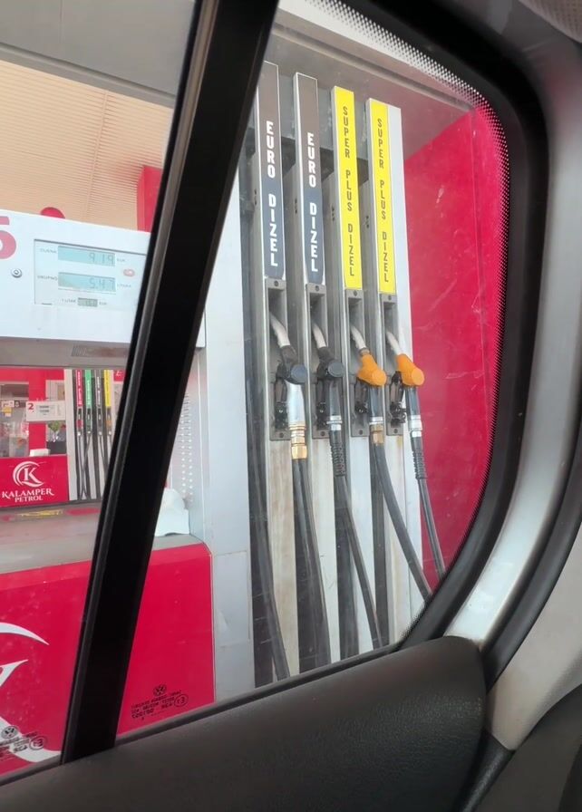 From inside a car, the view looks out to a gas station. The gas pump features nozzles labeled "Euro Dizel" and "Super Plus Dizel." The station itself is marked with "Kalamper Petrol" in red and white. A person wearing a white shirt and pants walks from the station toward the pumps.