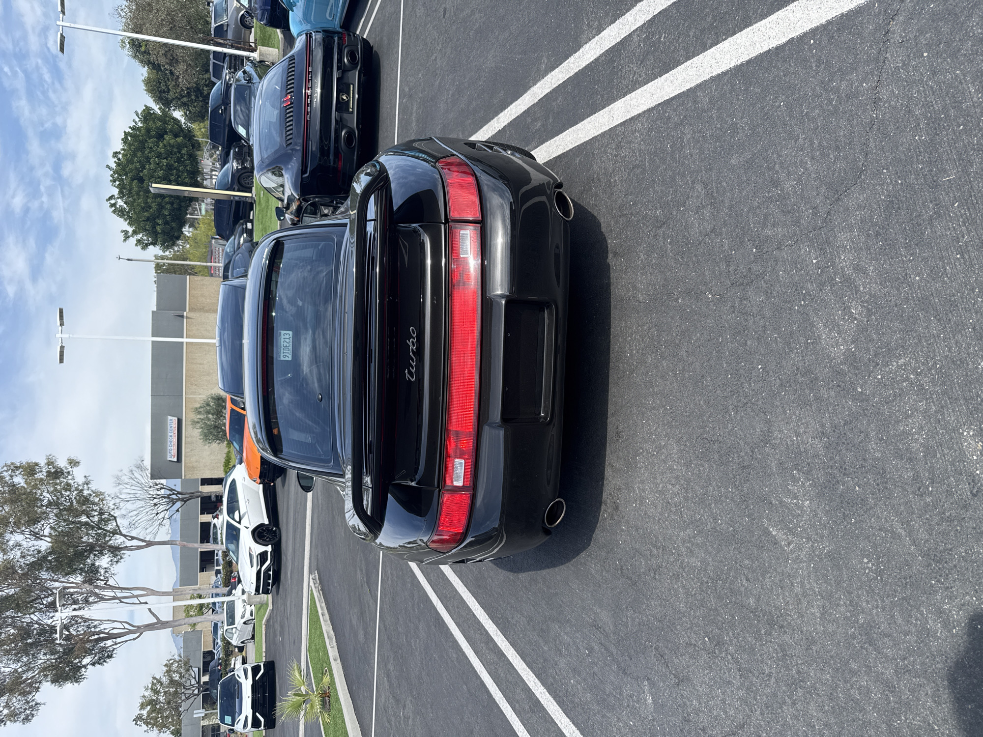 The image depicts the rear of a black Porsche 911 Turbo parked in a parking lot