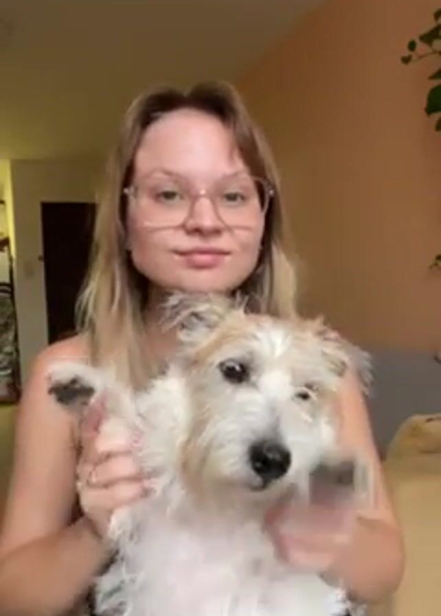 - "A woman wearing glasses holds a white terrier-mix dog in front of her chest, supporting its front paws with her hands" by FM-k41Xm2, licensed under CC BY 4.0