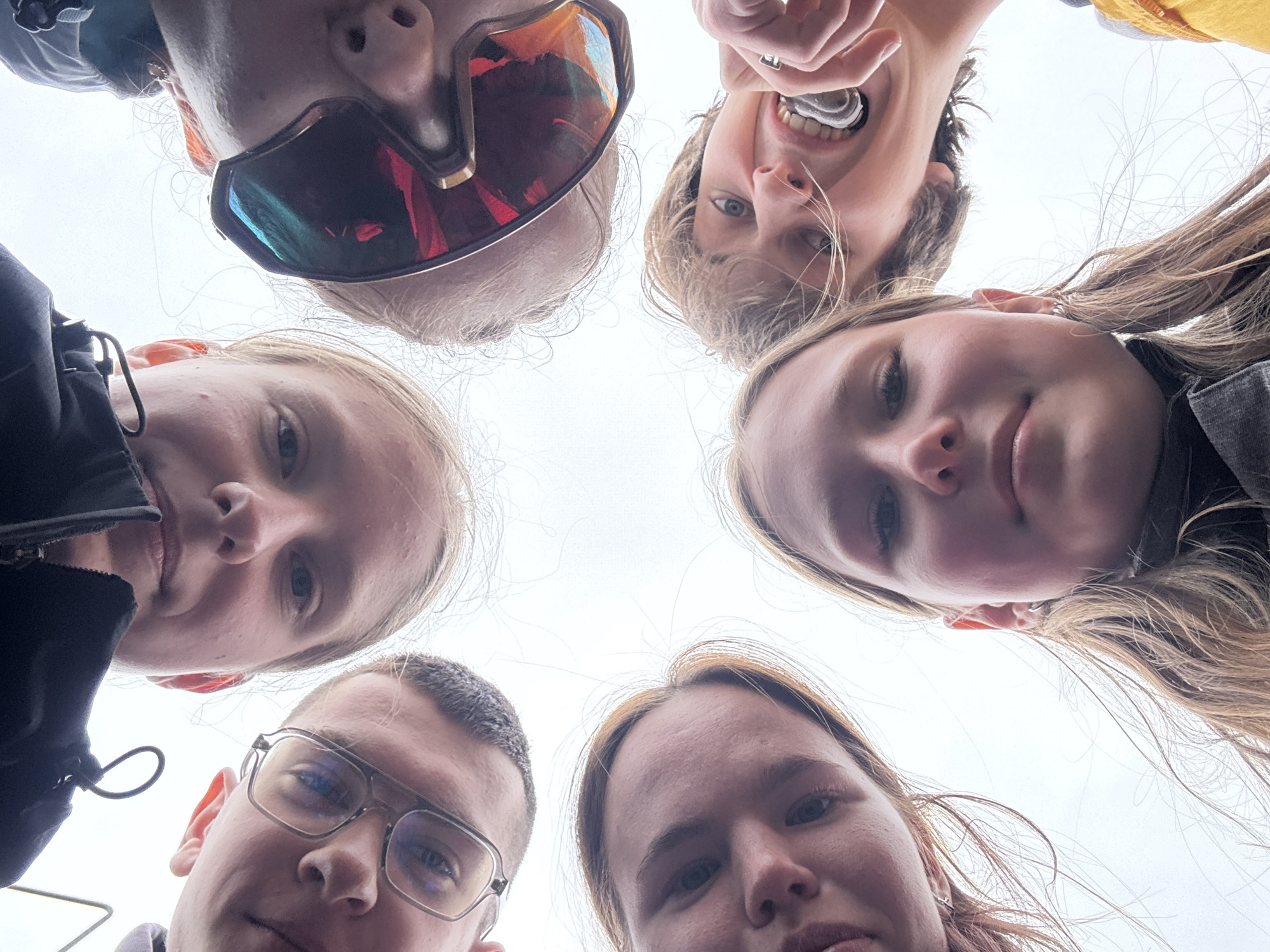 Six people are gathered closely in a circle, looking down at the camera. From left to right: a person with a black jacket and a person with sunglasses, next to a smiling individual, then a person with long hair. Below them is a person wearing glasses, and another person with reddish hair. There is a white sky visible in the background. The location of the image is not determinable based solely on the provided information.