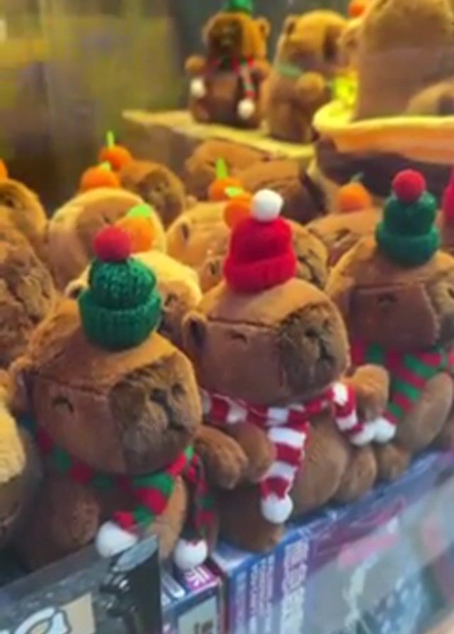 glass-encased display filled with small, brown, stuffed bear toys. Each bear wears a tiny knitted hat, either red or green, and a striped scarf in red, green, and white. Some bears have a small orange decoration on top of their head instead of a hat. Several bears are piled on top of each other, forming a tiered arrangement within the display. The background behind the bears is blurred, suggesting the scene is in a shop or arcade setting.