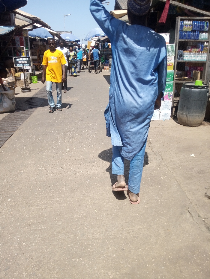 An outdoor scene depicts a paved thoroughfare, likely a market street, under bright daylight in Unknown, Unknown. In the immediate foreground, a male figure is observed from behind, walking away from the viewer. He wears a light blue traditional tunic over light blue trousers and pink flip-flops; his right arm is raised. His shadow extends to his left. In the midground, walking towards the camera, is a male wearing a bright yellow t-shirt, blue jeans, and dark sandals. Further into the background, numerous individuals populate the street, engaged in various activities, including walking and standing near stalls. One person in the background pushes a cart. The environment is flanked by market stalls with metal roofs and blue tarpaulins. On the left, a sign reads "MUHAMMAD KAKURI BOOK SHOP," positioned near sacks of goods and a green bucket. On the right, a wooden shelving unit displays bottled beverages and packaged items, adjacent to a dark grey plastic barrel. The sky is clear blue overhead.