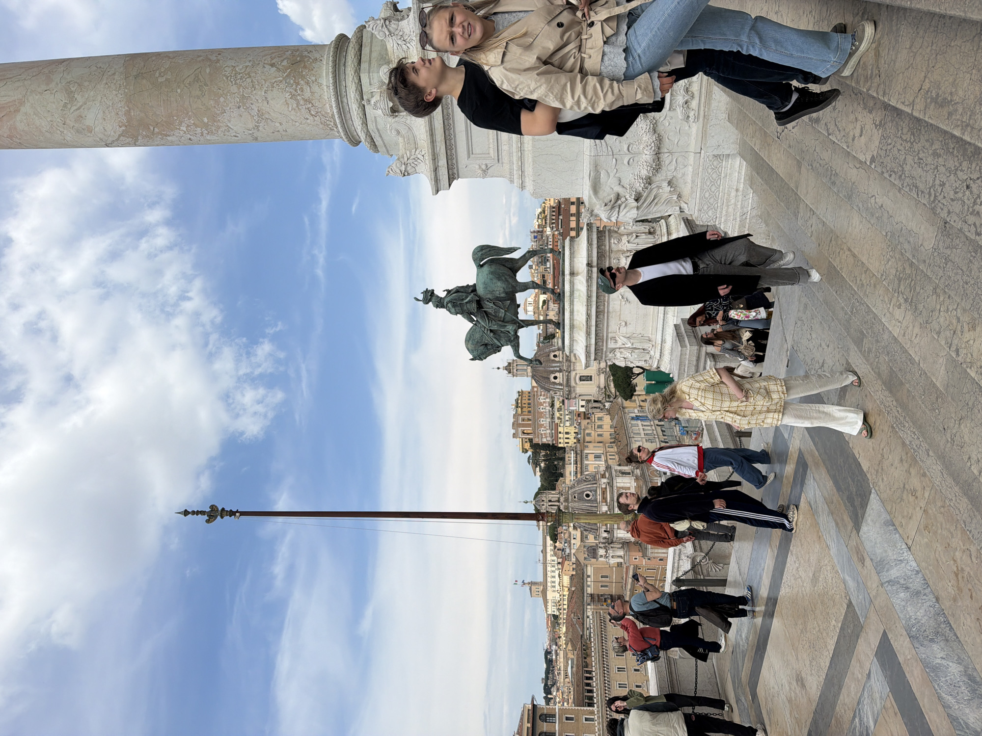 view from the top of the Altare della Patria in Rome, Italy. Two people are sitting atop the monument at the far end of the stairs, near a large column. Several other people are standing on the steps below, looking out over the city. In the distance, buildings of Rome can be seen under a blue sky with some clouds. A bronze equestrian statue is also visible. A pole with an ornate finial is rising from the steps.