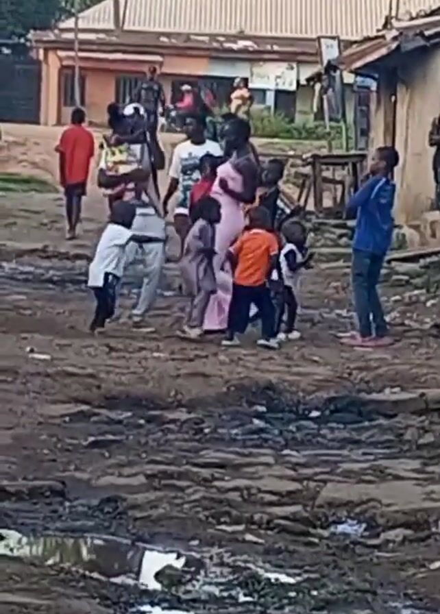 group of people, mostly children, gathered in a muddy and poorly maintained area that appears to be a street in a less developed neighborhood