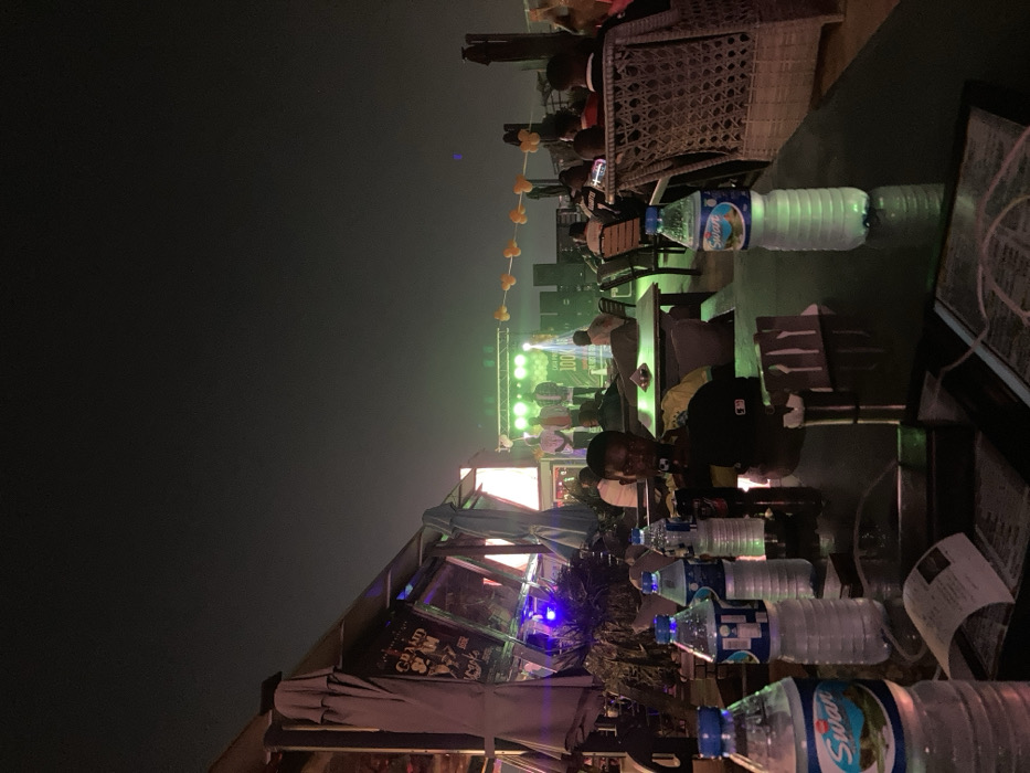 An outdoor evening scene reveals a live stage performance with multiple figures lit by green spotlights. Tables are occupied by people, with several water bottles placed on surfaces. A draped structure and menu are visible in the foreground, while a string of lights and city buildings are seen in the backdrop against a dark sky. The overall setting suggests an open-air restaurant or bar with entertainment.