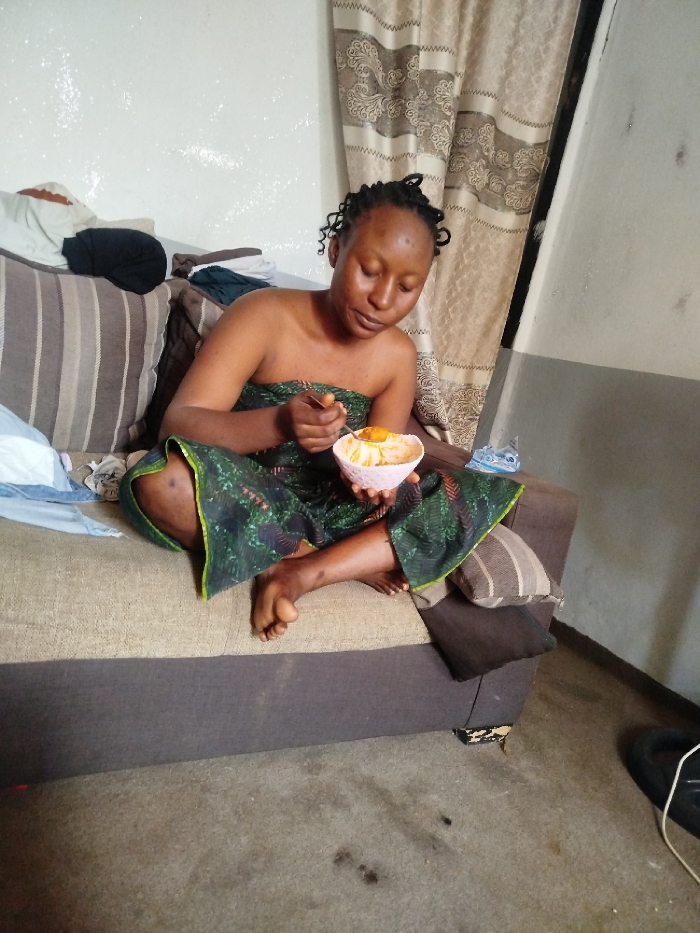 A female subject is depicted indoors in Mape, Nigeria, seated barefoot on a two-toned sofa. She is adorned in a dark green patterned fabric, wrapped around her lower body, leaving her upper torso bare. Her dark hair is styled in small braids or twists. The subject holds a small, light pink, textured bowl in both hands, actively using a metallic spoon in her right hand to consume its contents, which appear to be a light-colored liquid or paste containing orange solid fragments. Her gaze is directed downwards, focused on the bowl. The sofa features a light beige seating surface and a darker brown base. A striped pillow (brown, beige, white) is positioned behind her, and various articles of clothing are piled on the sofa to her left. The background reveals a white wall with some textural inconsistencies, and to the right, a patterned curtain and a two-toned wall with a dark grey lower section and a lighter upper section. The floor is a light-colored, possibly concrete surface, exhibiting several dark stains. A pair of black sandals with a white strap is visible on the floor to the right of the sofa. Small, dark marks are present on the subject's lower legs.