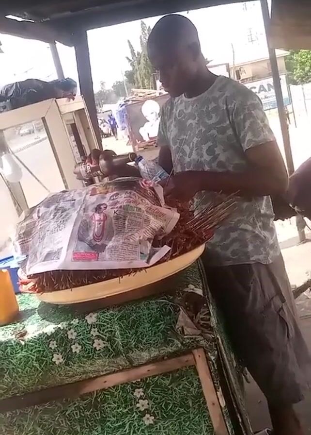 A man stands at a food stall beneath a makeshift awning. He wears a camouflage shirt and khaki shorts. He is using a thin, metal rod to skewer what appear to be roasted plantains. The plantains are piled on a large, yellow platter atop a green floral tablecloth. Newspaper is used to cover the top of the plantains. A yellow plastic container sits to the side. In the background, a street and buildings can be seen.