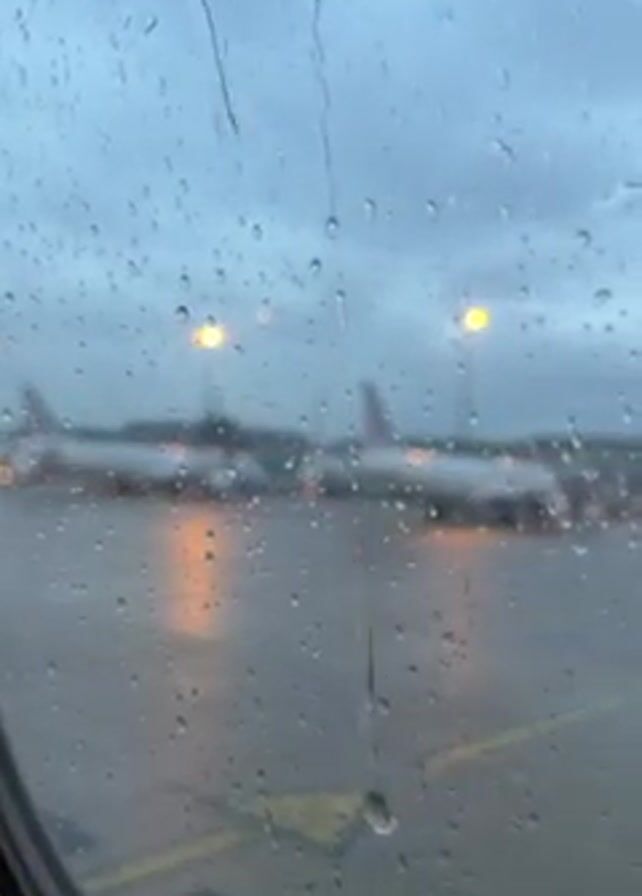 The view from inside an airplane shows a rainy airport scene