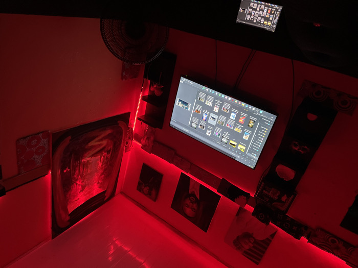 A small, red-lit room features an abstract painting, a fan, and a flat-screen TV displaying a screen of thumbnail images. A smaller screen is mounted above. Shelves are affixed to the walls. Various framed pictures adorn the walls, illuminated by a red LED strip. The overall aesthetic creates a dark, stylized, and tech-integrated space.