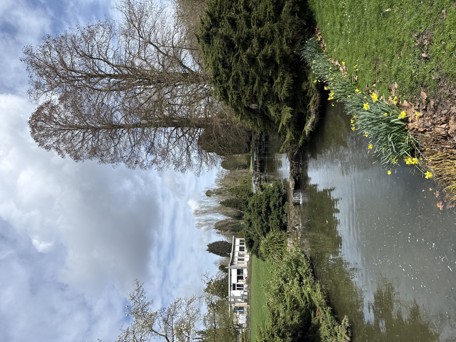 The image captures a park landscape in the city of Croix, France, under a partly cloudy sky. A dark, winding stream featuring multiple small, rocky cascades traverses the scene from the midground towards the lower left. The stream's immediate banks are heavily vegetated; the right bank is comprised of manicured green grass with a distinct border of yellow daffodils in full bloom. Various evergreen shrubs of differing sizes are positioned along the water and scattered across the wider environment. In the left background, a low-profile, modern building with white exterior walls and multiple windows is situated on a gentle grassy slope. The background is populated by numerous deciduous trees, some appearing to be in early bloom, while two notably tall, slender deciduous trees, largely bare of leaves, stand prominently in the upper right. No human figures or discernible activities are visible within the frame.