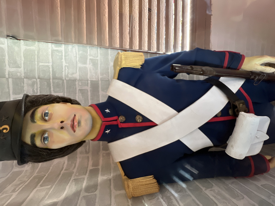 A wax figure depicts a soldier in a blue uniform with red trim, featuring white star details and gold epaulettes
