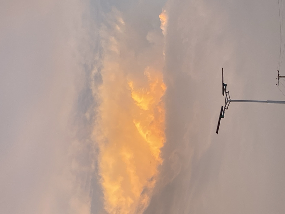 The image displays an outdoor scene in Lokoja, Nigeria, dominated by a cloudy sky during either sunrise or sunset. A prominent, elongated cloud formation in the upper-middle frame is intensely illuminated with vibrant orange and yellow light, contrasting with other surrounding clouds that appear in muted tones of pale grey, lavender, and light blue. In the lower-middle foreground, a modern, light-colored street light pole with two dark, flat, rectangular solar panels/luminaires extending outwards is visible. A dark utility pole with multiple horizontal wires is partially observed in the lower-right quadrant. No individuals, specific actions, or interactions are present in the scene.