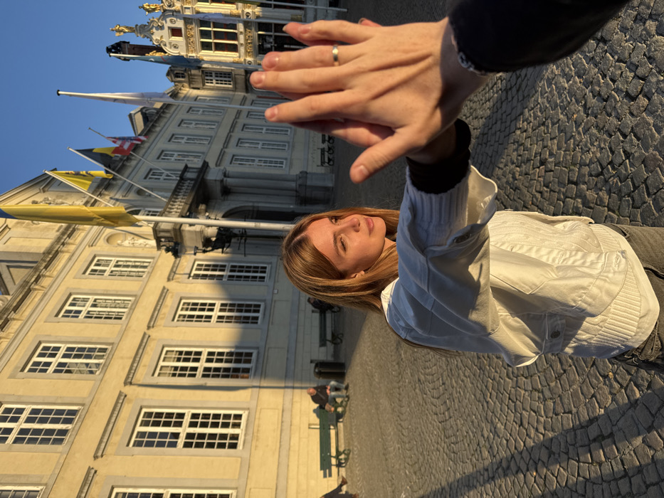 The image captures an outdoor scene at Burg Square in Bruges, Belgium, under golden hour lighting. In the immediate foreground, a person's right hand, wearing a gold ring on the ring finger, is positioned with the palm facing the camera. This hand appears to be interacting with the outstretched left hand of a woman in the mid-ground, suggesting a high-five or hand-touch gesture. The woman, with long reddish-brown hair and wearing a white textured sweater-jacket over a lighter shirt and dark pants, faces to the right, her profile illuminated by the low sun. The ground is paved with cobblestones, displaying prominent shadows. In the background, a large, pale yellow classical building, identified as the Provinciaal Hof, occupies the left and central frame. It features multiple stories with tall, white-framed windows and a central portico. Several flagpoles extend from the building; a prominent yellow and blue flag (Ukraine) and a red, black, and yellow flag (Belgium) are clearly visible. To the far right, a portion of a darker, more ornately decorated building can be seen. Further in the background on the left, two individuals are seated on a green park bench, with another similar bench and a dark waste receptacle nearby.