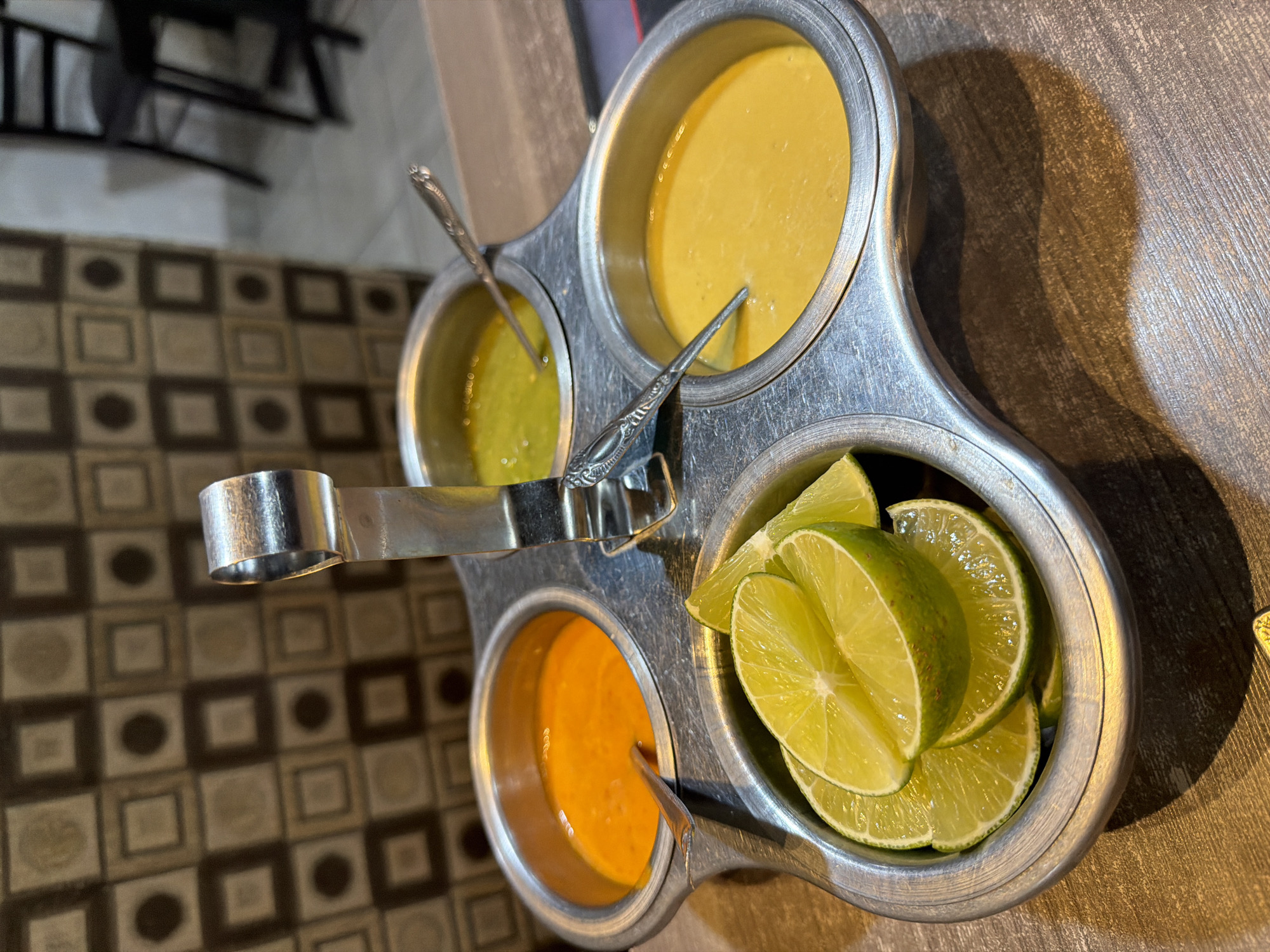 A metal serving dish containing lime slices and three types of sauces is situated on a table with a brown wood grain surface. Spoons are present in each of the sauce compartments. A silver-colored clip is attached to the side of the container. The setting appears to be a restaurant in Cholula, Mexico. The flooring in the background has a geometric pattern.