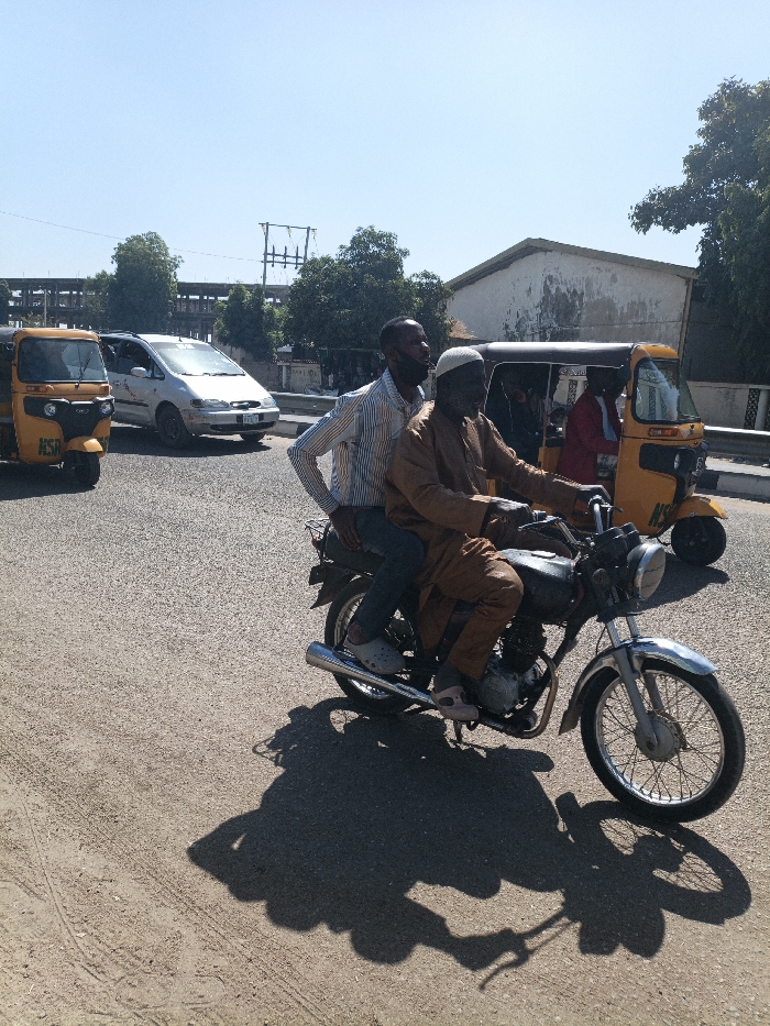 The image depicts a sunlit street scene in Giginyu, Nigeria. In the foreground, a dark-colored motorcycle is in motion, carrying two adult males. The driver, an older male, wears a light brown full-body traditional garment and a white skullcap, gripping the handlebars. The passenger, a younger male, is seated behind him, wearing a blue and white striped long-sleeved shirt, dark trousers, and light-grey Crocs-style footwear; he has a dark beard and a black face mask pulled below his chin. The road surface is asphalt, with prominent shadows of the motorcycle and its occupants cast onto it. To the left of the motorcycle, a yellow three-wheeled auto-rickshaw (keke Napep) with "KSA" visible on its side is either stationary or moving slowly. Behind it, a silver minivan is visible. To the right of the motorcycle, another yellow three-wheeled auto-rickshaw is partially visible, with a person in a red garment inside. The background features a light-colored building with a flat roof, scattered green trees, and utility infrastructure including power lines and a structural framework under a clear blue sky.