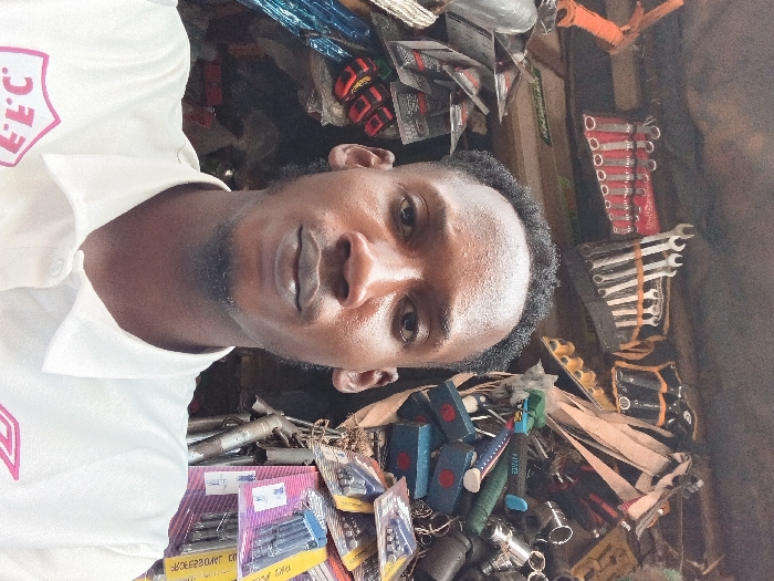 A dark-skinned male, estimated 20-35 years old, is depicted in a frontal portrait, likely a selfie, within an auto parts or hardware shop in Onitsha, Nigeria