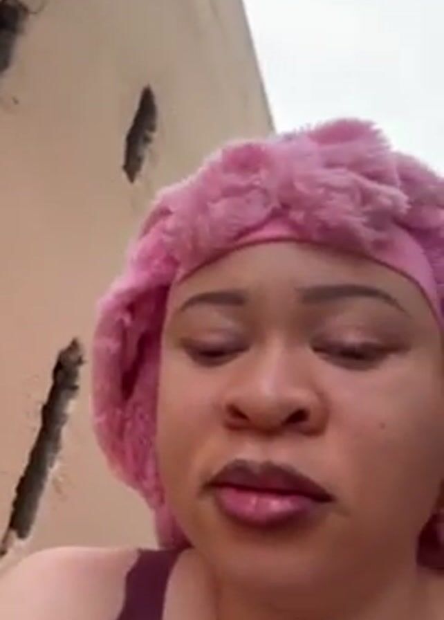 A woman with fair skin, wearing a pink fuzzy bonnet and a maroon tank top, is looking at the camera and talking. She has dark lipstick on. The background includes a tan-colored wall with a hole in it, a metal railing, and a cloudy sky. The video appears to be filmed outdoors, potentially in a narrow space between buildings. There is a low, droning sound.