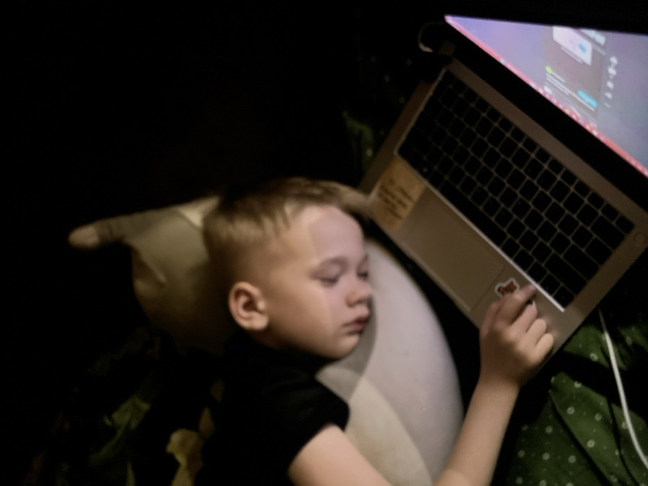 The image depicts an indoor scene in Dmitrov, Russia, under dim lighting conditions. A fair-skinned individual, appearing to be a child or young adolescent, is lying on their left side, seemingly asleep. Their head rests on a light-colored pillow. They are wearing a dark-colored short-sleeved top and are partially covered by a dark green patterned fabric. An open, silver-colored laptop is positioned in front of the individual. The laptop's screen is illuminated, displaying a graphical user interface with various colored elements. A dark-colored sticker is affixed to the laptop's palm rest, and a light-colored cable is connected to the laptop's left side. The individual's right hand rests passively on the laptop's palm rest.
