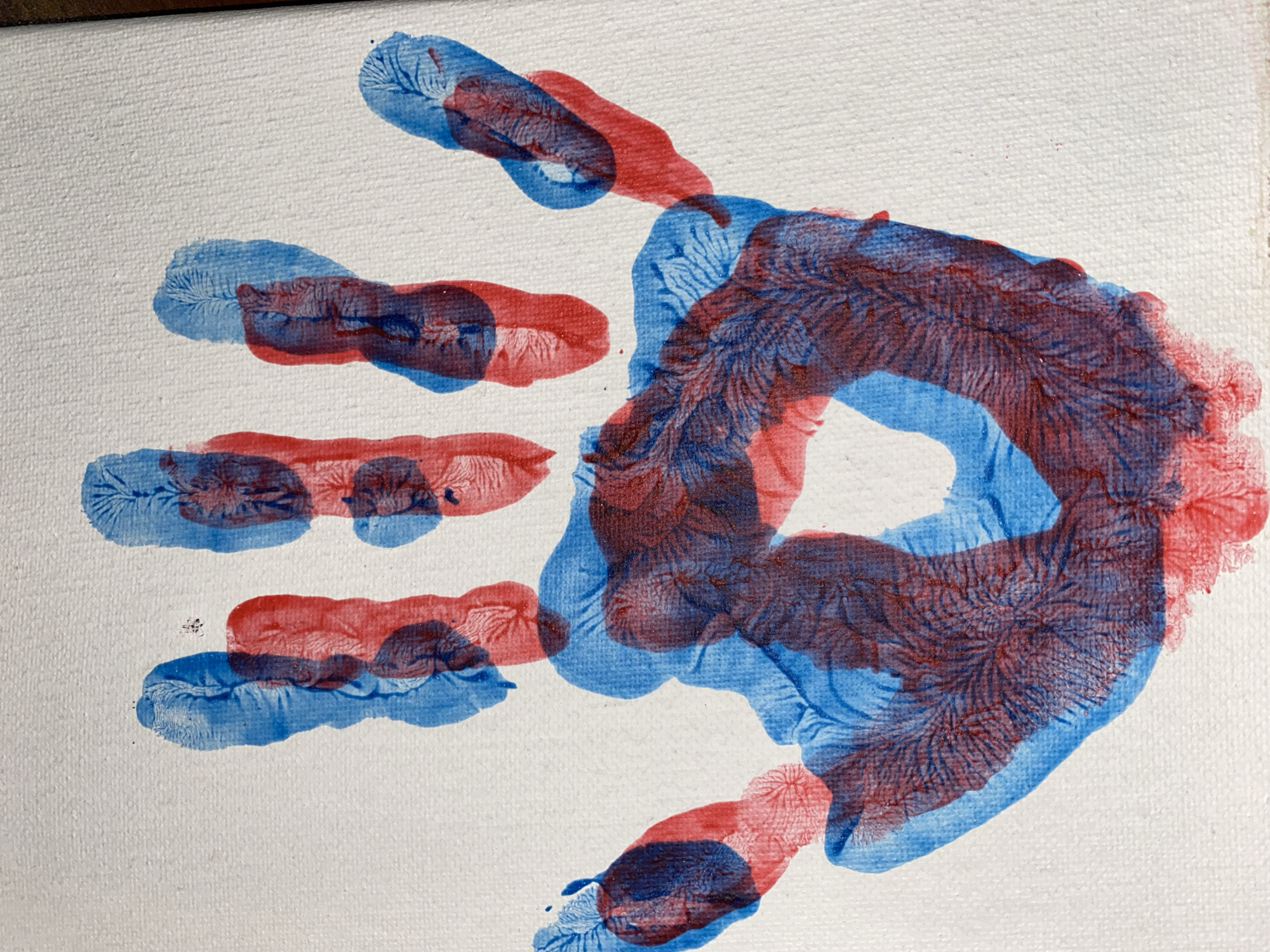 A close-up shot presents a handprint art piece on a white canvas. The handprint is rendered using two colors: blue and red, with the blue print slightly offset from the red, creating a double image effect. The patterns within the prints appear somewhat organic, suggesting the texture of skin or a fluid medium. The canvas surface is visible around the print, showcasing its texture. No people or identifying location markers are present in the image.
