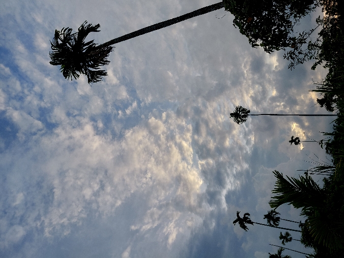 The scene depicts an outdoor tropical landscape in Keude Cunda, Indonesia, under a partially clouded sky. The upper two-thirds of the image are filled with a sky exhibiting a mixture of blue patches and widespread, mottled stratocumulus or altocumulus clouds. Diffuse, brighter light is visible through and behind the clouds, suggesting either sunrise or sunset. The lower third of the image features a dense silhouette of various tropical plants. Multiple tall, slender palm trees are prominent, with their fronds distinctly silhouetted against the sky. A particularly tall palm tree stands in the upper right quadrant. Other palm trees of varying heights and dense, leafy undergrowth occupy the foreground and mid-ground. No human subjects, animals, or artificial structures are discernible within the frame.