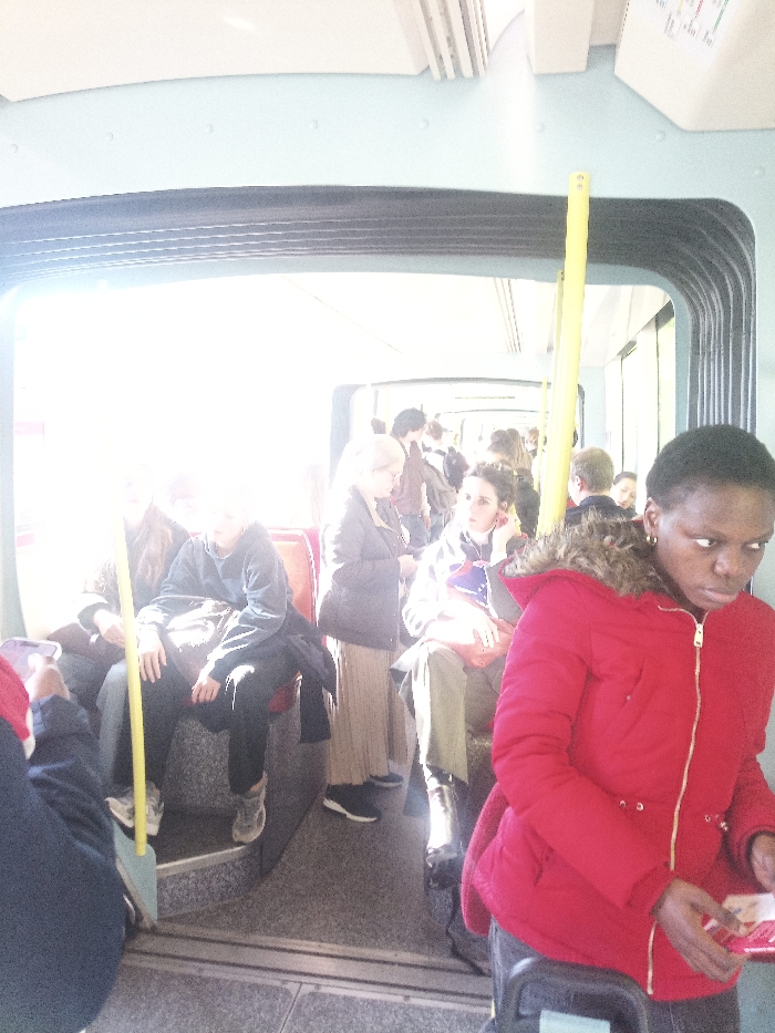 The image displays the interior of a public transport vehicle, likely a train or tram, with the specific location in the city of Unknown, Unknown, undetermined