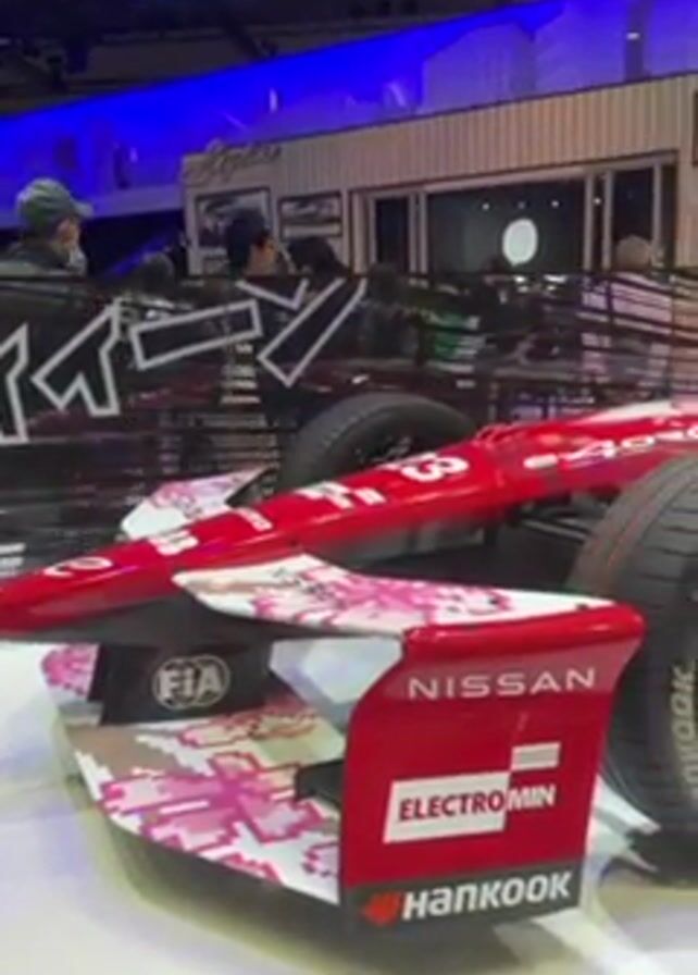 red and white Nissan race car at a trade show