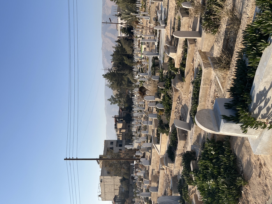- "An outdoor wide shot captures a large, densely packed cemetery in Jirud, Syria, under a clear, bright blue sky" by FM-NiDCC3, licensed under CC BY 4.0
