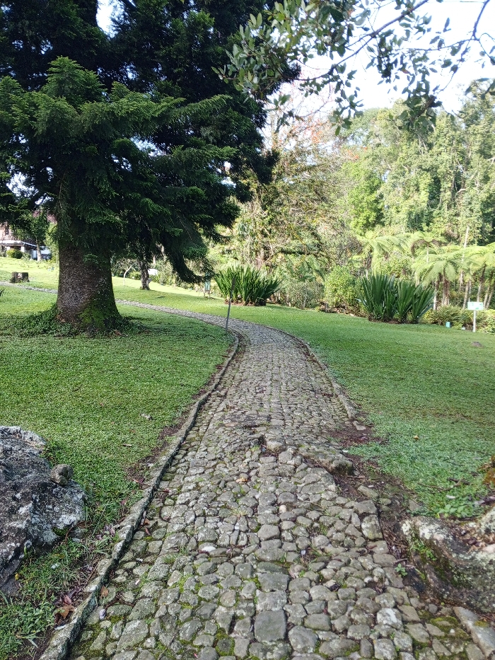 A stone pathway winds through a lush green park. A large evergreen tree with sprawling branches anchors the scene on the left. The pathway, made of small, irregularly shaped stones, leads into the distance, surrounded by manicured grass. Various shrubs and trees create a verdant backdrop. A stone is partially visible in the lower left corner, adding to the natural aesthetic of the park.