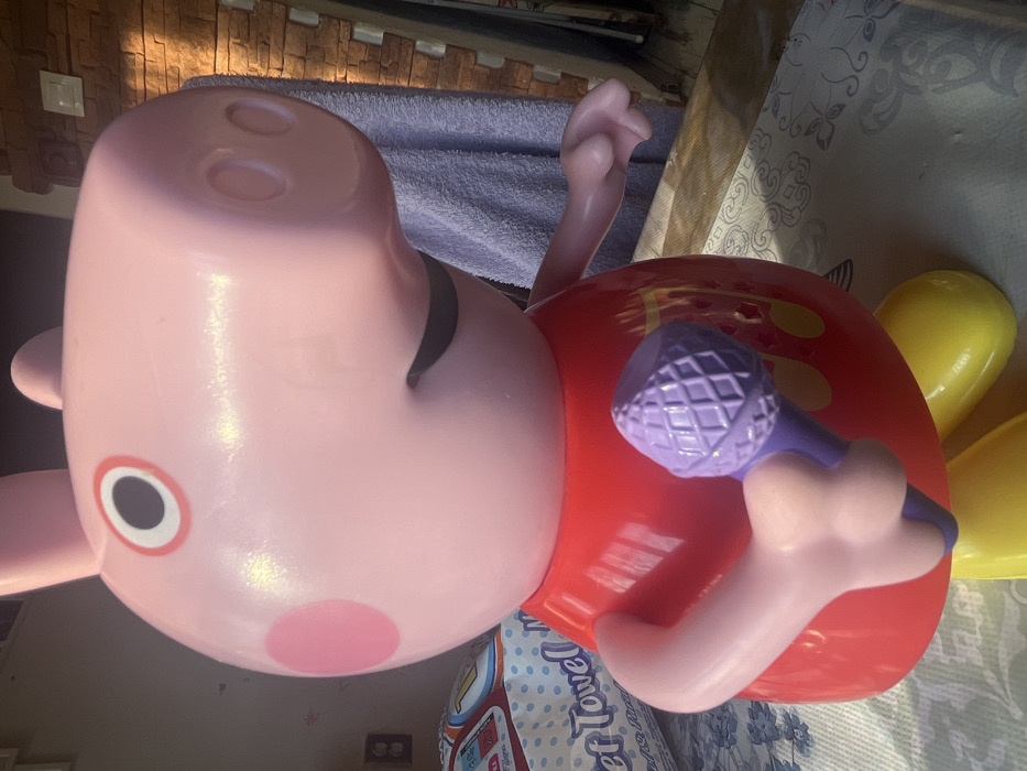 - "A large, pink plastic Peppa Pig figurine stands prominently, angled slightly to the viewer's right" by FM-s5tUw2, licensed under CC BY 4.0
