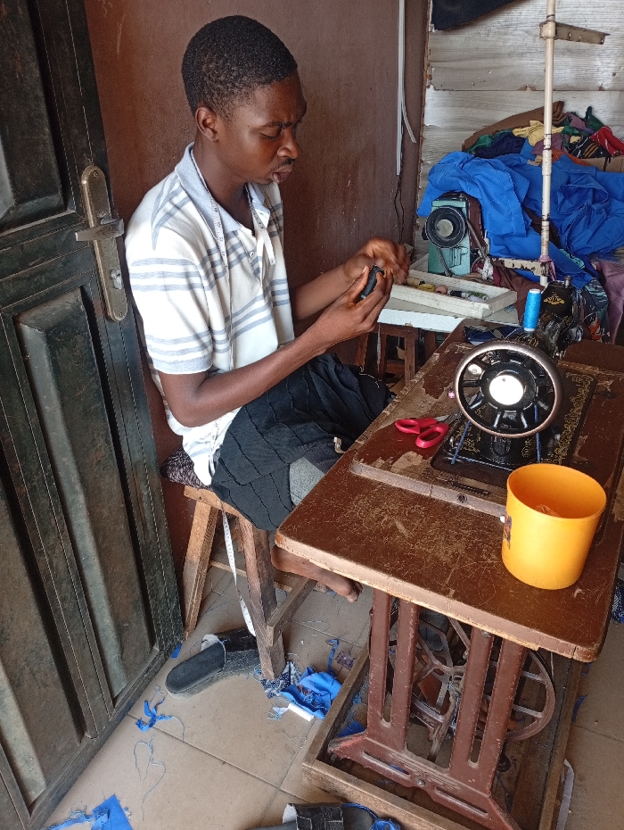 A young man is seated on a wooden stool at a treadle sewing machine. He holds a small, dark object in his hands, appearing to work on it. He is wearing a striped polo shirt and dark pants. The machine sits on a worn wooden table. A yellow container and red scissors are on the table. A second sewing machine is behind the first, along with fabric scraps. A measuring tape is around his neck. Shoe and fabric scraps are on the floor next to the door.