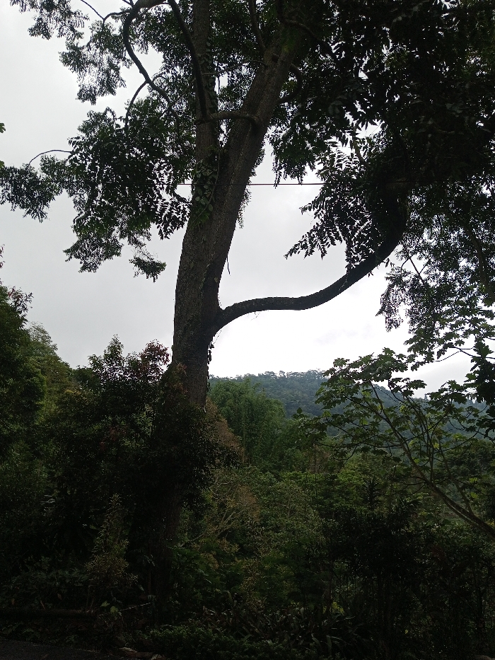 This image, taken in Ambakirano, Madagascar, depicts a dense natural landscape. A large, mature tree with a textured trunk, partially obscured by clinging vines, occupies the central and left foreground. Its dark green, full canopy extends across the upper frame. Below and surrounding this prominent tree, a thick layer of diverse green foliage and smaller plants forms the midground, with areas of deep shadow. In the background, a range of forested hills rises under an overcast, light gray sky. No human subjects, artificial structures, or discernible activity are present in the scene.