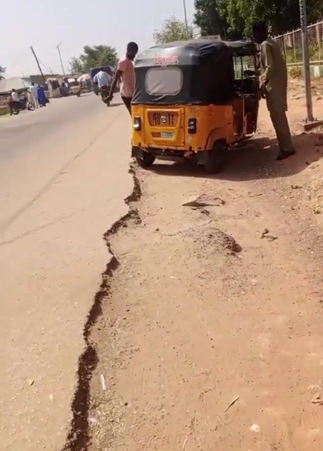 A yellow three-wheeled vehicle with the word “Arsenal” on the black roof appears to be stuck in a ditch. Two men are attempting to push the vehicle. One man wears a light green tunic and is actively pushing the vehicle. The other man wears a pink long-sleeved shirt and is standing by the vehicle. Two women wearing headscarves are standing nearby on a dirt patch. The road is cracked and damaged. In the background, more people and trees can be seen. The scene is brightly lit, suggesting a sunny day.