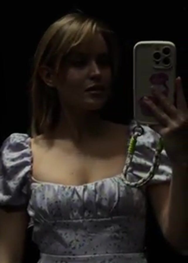 A young woman with shoulder-length blonde hair and bangs is taking a selfie in front of a mirror. She is wearing a light purple dress with short, puffed sleeves and a floral pattern. Her phone has a white case with a small purple decoration and a neon green and white strap. The background is dark and indistinct, possibly a dressing room or small space with dark walls. The lighting is dim, emphasizing the woman's face and dress. She looks at the phone camera with a slight smile. A voice is heard speaking in the background, seemingly unrelated to the woman's actions.