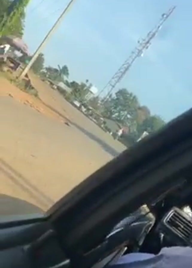 view from inside a moving car, driving on a paved road in what appears to be a rural or suburban area