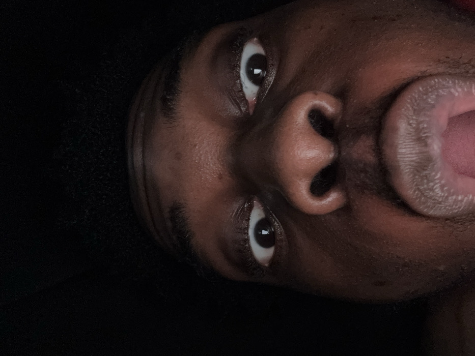 An extreme close-up, low-angle portrait captures the face of a dark-skinned individual, appearing to be an adult male, filling the majority of the frame