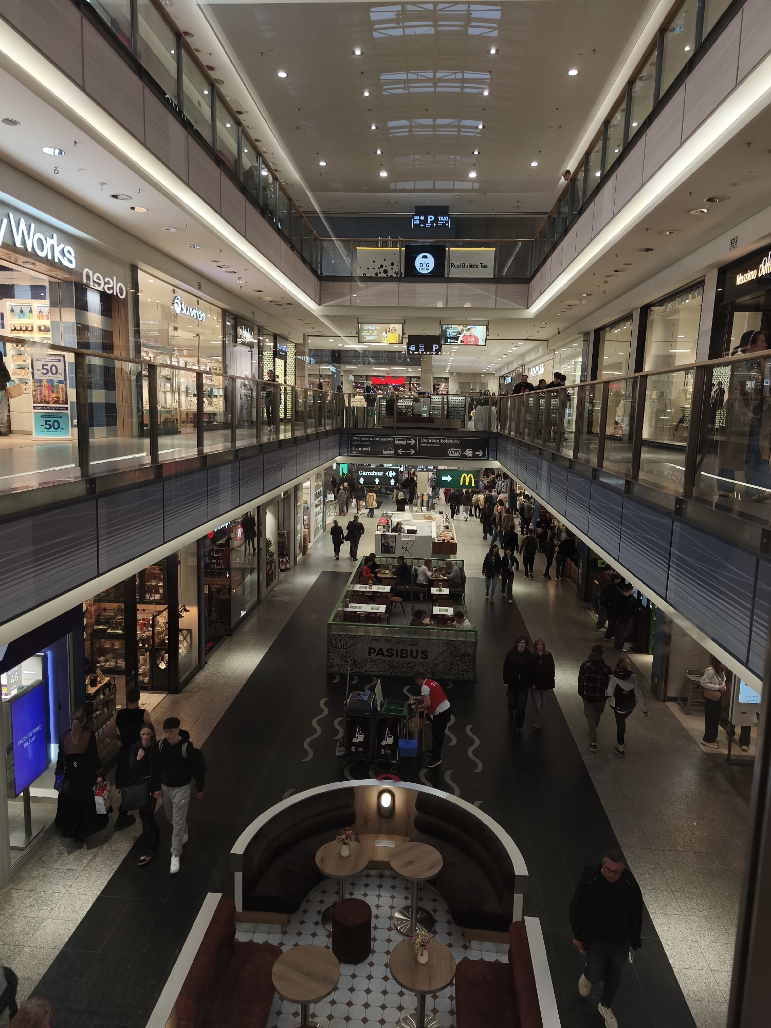 This is an indoor shot of a shopping mall in Krakow, Poland. The image is taken from an elevated position, likely from an upper level of the mall, providing a comprehensive view of the multiple floors. The mall is bustling with people walking around, browsing shops, and engaging in different activities. The architecture of the mall features multiple floors with glass railings that allow a clear view of the activity on lower levels. Various shops are visible on both sides of the walkway, each with distinctive branding and displays. At the bottom of the frame, there is a cafe with circular tables and plush seating, adding to the shopping experience. Signage throughout the mall directs patrons to various amenities, including public transportation options. The overall lighting is bright and even, contributing to the mall's open and welcoming ambiance.