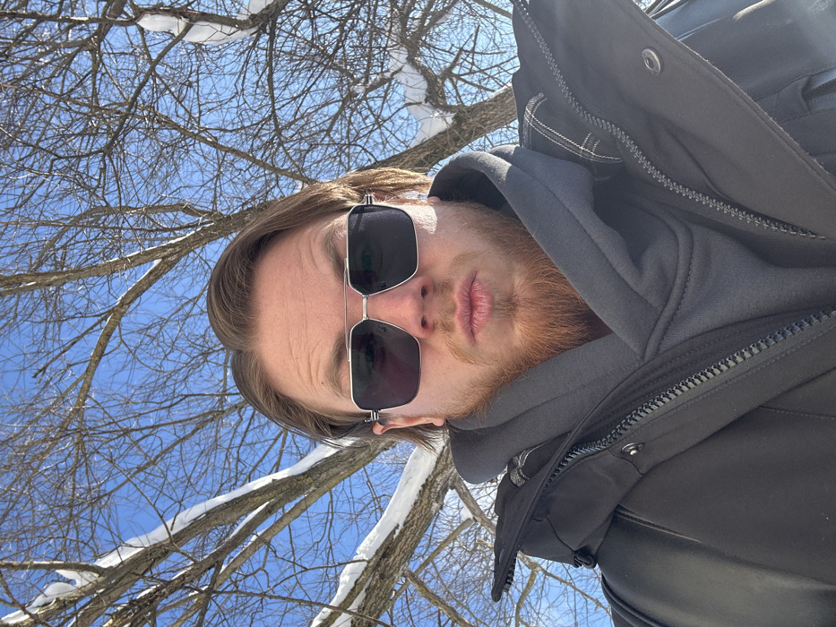 A male individual is depicted in a close-up outdoor portrait, presumably taken in Prokhorovo, Russia. He has light brown hair swept back, a red-blonde beard and mustache, and is wearing silver-framed aviator-style sunglasses with dark lenses. A small white smudge is present on his right cheekbone. He is dressed in a black winter jacket with a visible zipper, worn over a grey hooded sweatshirt. The individual is making a puckered lip expression, directly facing the camera. The background consists of a clear blue sky and bare deciduous tree branches, some of which are covered in patches of snow, indicative of a winter environment.